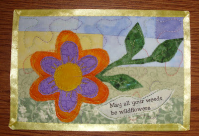 I finally spent some time making quilted postcards. I pieced the background from scraps and then free-motion quilted before adding the feature elements. The applique flower and butterfly are made from scraps with fusible web. I printed sayings onto fabric and added fusible web to the back. I love the saying about weeds and wild flowers. I had a difficult time finding a saying I wanted for the butterfly postcards.