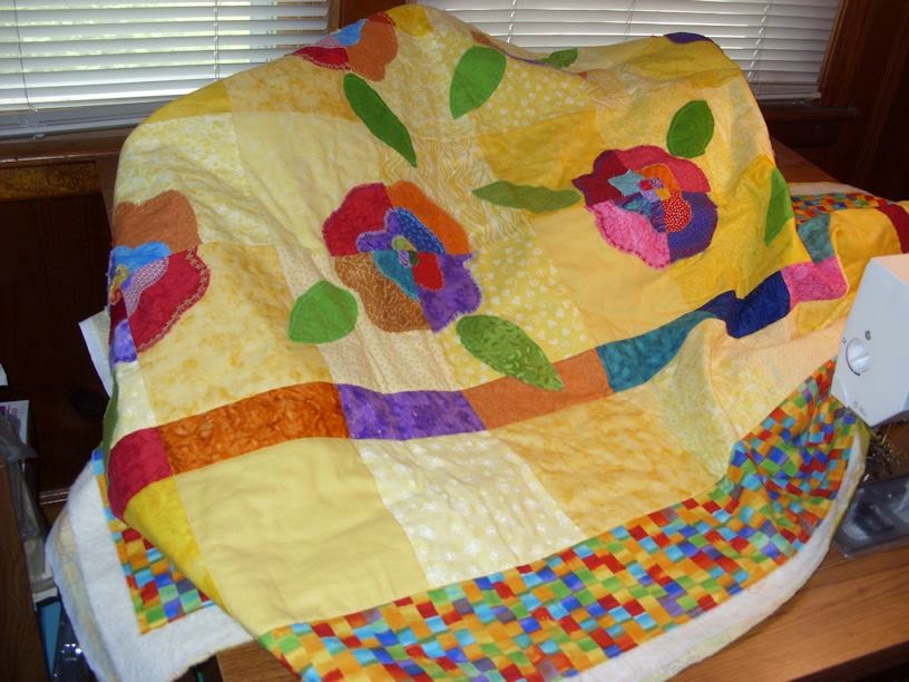 Then I finally pulled out a UFO to work on. The chopped flower blocks are at least 4 years old. Now the top is sandwiched and I started quilting. I used the walking foot to stitch-in-the-ditch on each side of the inner border and the outer border.