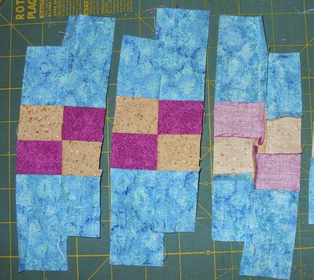 At both ends add a 4 ½” half-square triangle of the spacer fabric to